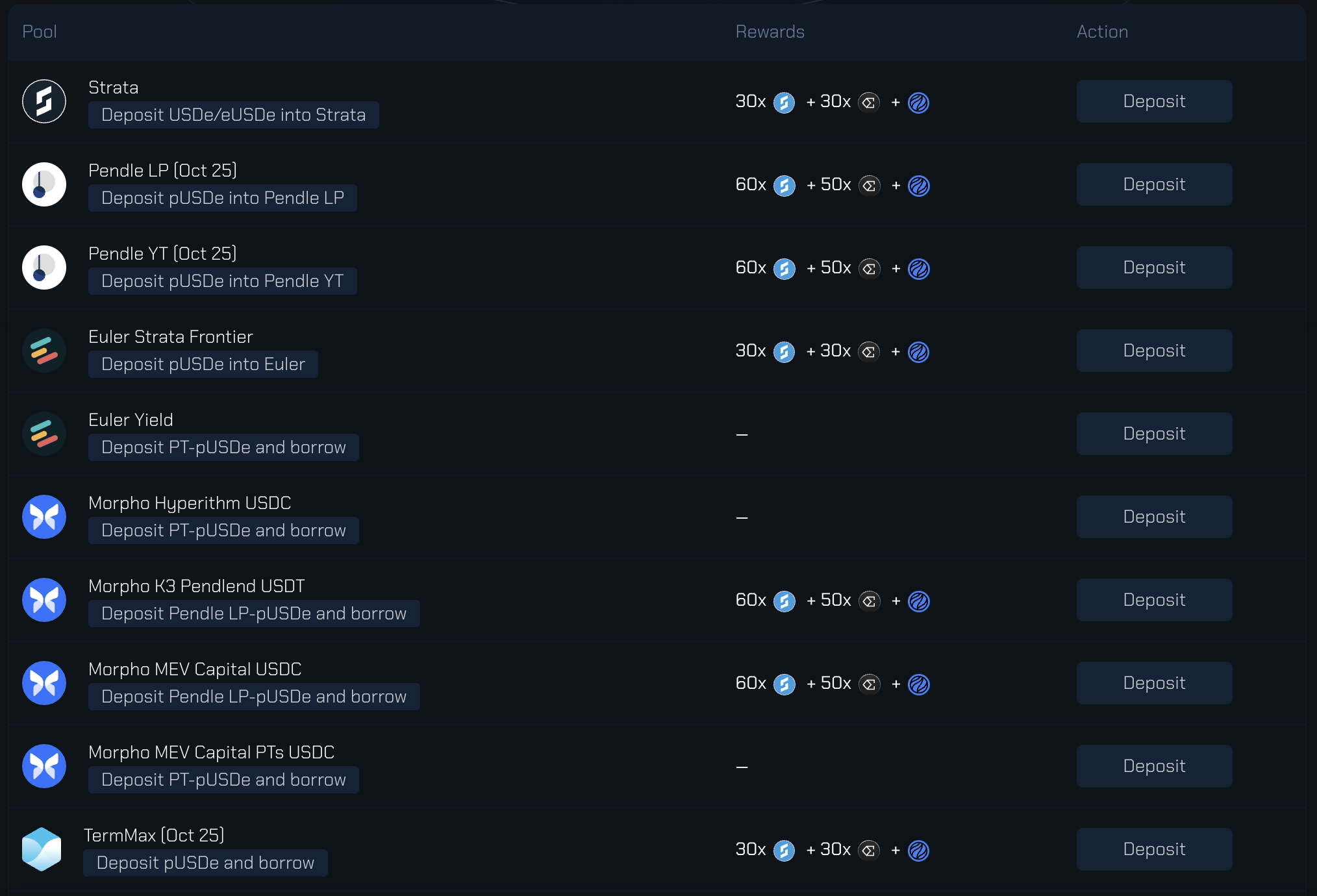 To bootstrap adoption and reward early contributors, Strata launched a Points Program. During the initial rollout (Season 0), users who deposit USDe or eUSDe receive pUSDe, a redeemable receipt token that accrues Strata Points. These points track participation across the ecosystem: deposits, integrations, and other partner activities. They are expected to play a role in future governance, reward distributions, or token launches. By making pUSDe composable across DeFi, Strata ensures participants can still deploy their capital while earning points, effectively combining early-user incentives with ongoing capital efficiency.